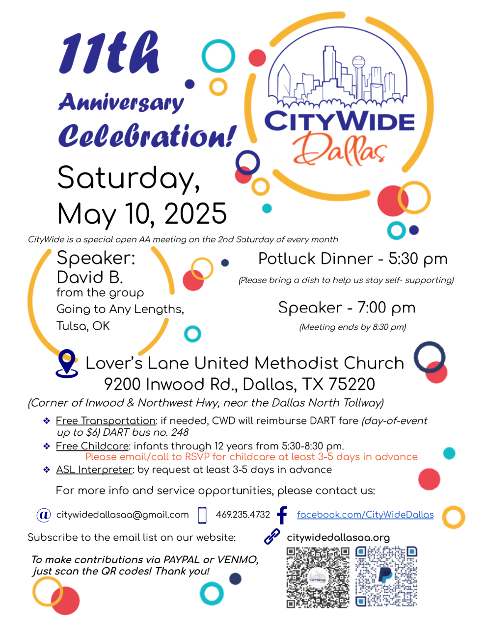 As you may know, CityWide Dallas is a monthly open AA speaker meeting, held on the second Saturday of each month. We would like to invite you to attend and set up a table to help spread the word about general service and inform our attendees about NETA 65—who you are and what you do.