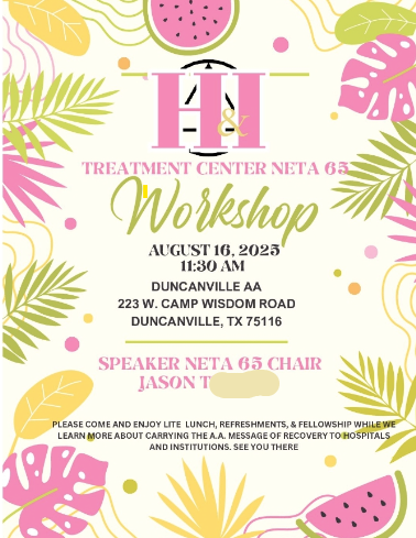 Rowlett Group 362 Oak Trail # 162, Garland, TX, United StatesJoin us for: Fun and Fellowship Questions for collaborating with La Vina How to write about your experience AA members share about being published in LV Questions and Answers