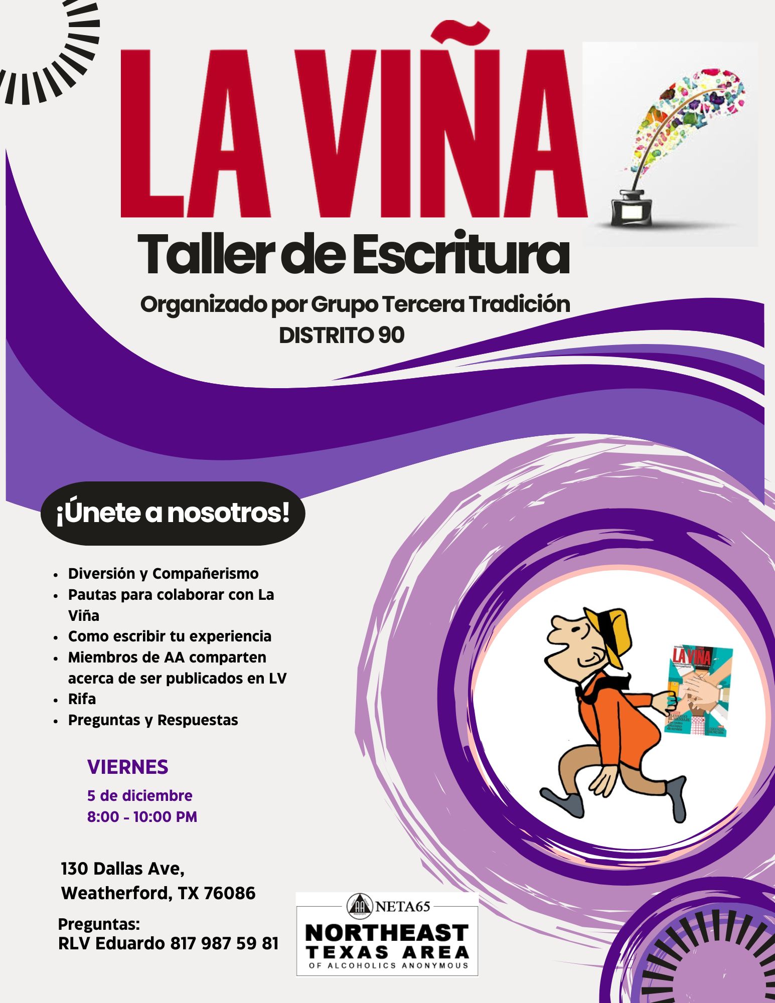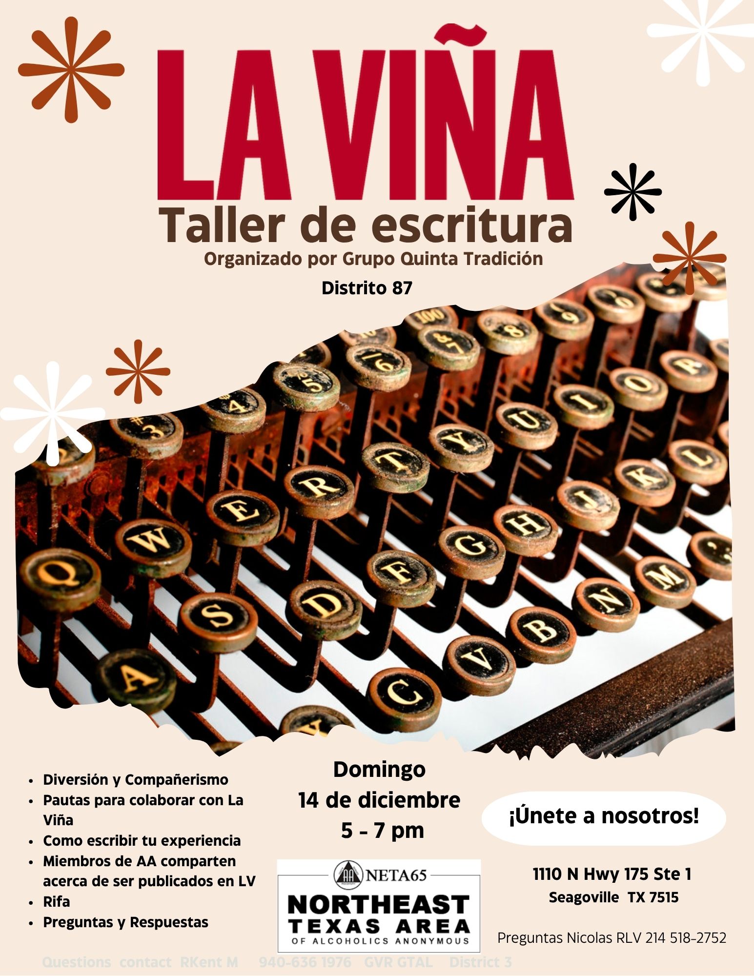 Grupo Quinta Tradicion 1110 N Hwy 175 Ste 1, Seagoville, TX, United StatesGrupo Quinta Tradicion District 87 Fun and Fellowship Questions for collaborating with La Vina How to write about your experience AA members share about being published in LV Raffle Questions and Answers